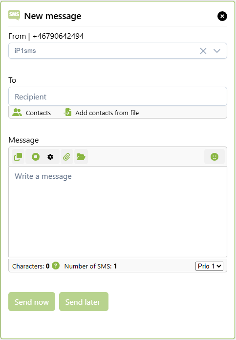 Here you write your SMS message. An SMS requires 160 characters and you can always see how many characters you have written and how many SMS your message consists of at the bottom.