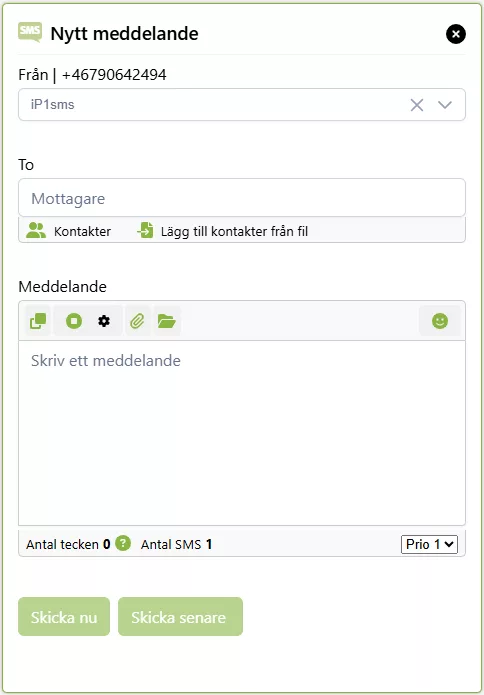 Här skriver du ditt SMS-meddelande. Ett SMS betstår av 160 tecken och du kan hela tiden se hur många tecken du skrivit samt hur många SMS ditt meddelande består utav längst ned.